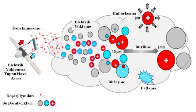 Bulut içinde elektrik yükü yayımı, damlacık yüklemesi ve damlacık büyütmenin kavramsal resminde bulut elektrik yükü ile yüklendiğinde su damlacıkları birleşerek büyümektedir. Elektrik deşarj iyonları, bulut içinde uçabilen, bu iş için tasarlanmış bir İHA tarafından serbest bırakılmakta ve su damlacıklarına elektrik yüklemektedir. Elektrik yüklemesi sayesinde serbest kalan iyonlar bulut içindeki su damlacıklarına tutunarak onların artan bir oranda büyümelerine neden olmaktadır. Bulut içindeki su damlacıklarının büyüme oranında artışa neden olan elektrik yüklemesi sayesinde yağış gerçekleşmektedir.