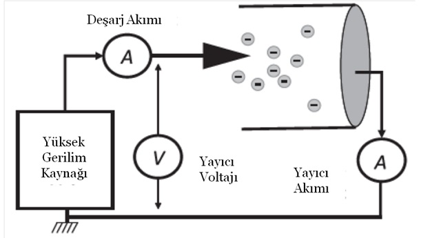 Tek şarj yayıcı kavramsal diyagramı. Kontrollü yüksek voltaj, yayıcı uca (siyah ok) ve Şekil 2’de gösterilen izole ölçüm sistemiyle belirlenen deşarj akımına uygulanır.