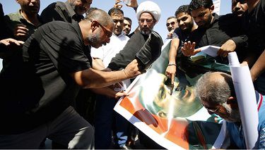 Protestocular 14 Ekim 2016 günü Basra’da icra edilen bir gösteri esnasında, Türkiye Cumhurbaşkanı Recep Tayyip Erdoğan’ın posterini parçalıyorlar. Foto: REUTERS / Essam Al-Sudani)