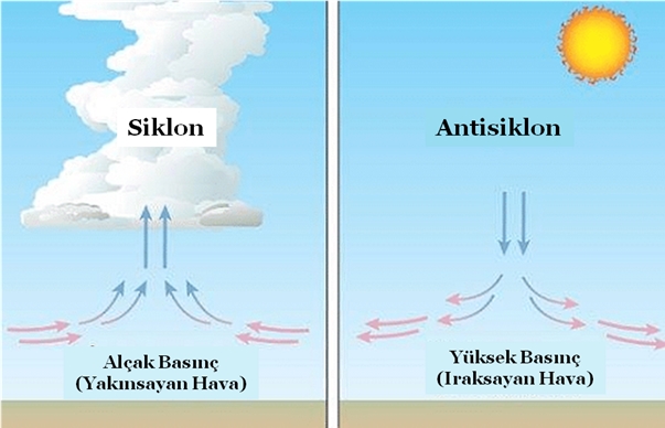 İzobarlarla kapalı olarak çevrili, kendi etrafında dönen, konverjansın olduğu ve merkezinde etrafına göre basıncın en düşük olduğu alan. Siklonlarda dönüş, kuzey yarımkürede saat yönünün tersine, güney yarımkürede ise saat yönündedir. Genellikle alçak basınç sistemi olarak ifade edilir. Aynı kavram Hint Okyanusundaki tropikal siklonlar için de kullanılır. Siklonik dönüş kavramı, toz hortumlarında, kasırgalarda, tropikal ve ekstra tropikal sistemlerde de kullanılır. Antisiklon veya yüksek basınç sisteminin tersidir. Kapalı izobarlarla çevrili ve göreceli olarak basıncın yüksek olduğu alan. Basınç gradyan kuvveti, merkezden dışarıya doğru olduğundan, rüzgâr; kuzey yarımkürede, dışarıya doğru spiral olarak ve saat yönünde, güney yarımkürede ise saat yönünün tersine eser. İki tür antisiklon vardır: Soğuk çekirdekli antisiklon: Yerin havaya göre daha soğuk olması durumudur. Bu durumda basınç yükseklikle birlikte çok çabuk düşer, yer soğur. Sıcak antisiklon: Derin sistemlerdir ve yüksek basınç uzun süre devam eder. Hava yere göre daha sıcaktır. Kaynak: Meteoroloji Genel Müdürlüğü, İllüstrasyon: Prepp by Collegedunia