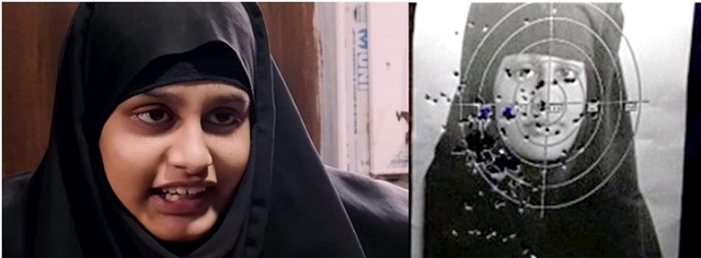 Solda; gençliği ve masumluğu ile Hollandalı dininden dönme IŞİD’li terörist Riedijk’in 10 gün içinde aklını başından alan gelin Begum ve sağda bir atış alanında hedef olarak kullanılan posteri. Kaynak: SCAN ve OTS News