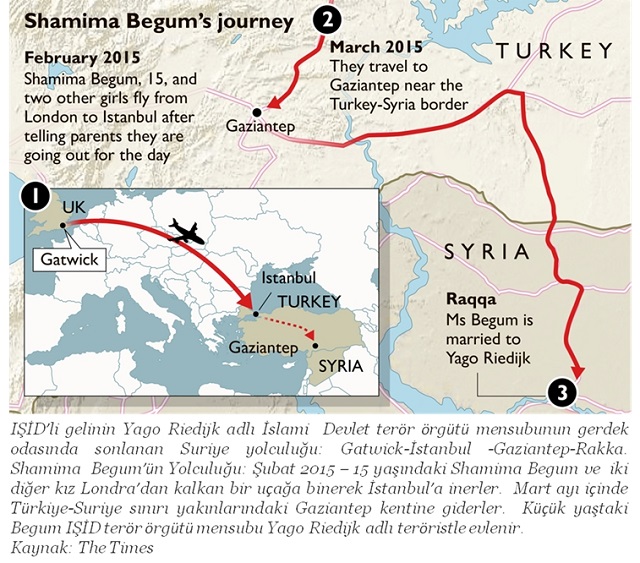 İslami Devlet terör örgütüne katılmak maksadıyla, 2015 yılı Şubat ayında Suriye’ye giden ve üç yıldan fazla bir süredir IŞİD idaresi altında yaşayan Londralı üç okul kızından bir tanesi olan Bayan Begum, geçtiğimiz yıl bir Suriye mülteci kampında dokuz aylık hamile olarak bulunmuştur.