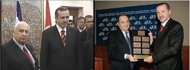İsrail basını tarafından kafayı Arap ülkelerinin İsrail ile ilişkilerini normalleştirmesine taktığı iddia edilen Recep Tayyip Erdoğan solda 2005 yılında gerçekleştirdiği ilk ve son İsrail ziyareti esnasında İsrail Başbakanı Ariel Sharon ile kameralara poz verirken görülmektedir. Sağda ise ADL (Anti-Defamation League – İftira ve İnkârla Mücadele Birliği) Ulusal Direktörü Abraham Foxman’dan ‘‘Courage to Care’’ ödülünü alırken görülmektedir. Erdoğan ödülü alırken yaptığı konuşmada Türk ulusunun yüzyıllardır Yahudi halkı ile birlikte yaşadığını ve gelecekte onlarla yakın ve dostane ilişkilerini sürdüreceğini ve ırkçılığa karşı birlikte kararlılıkla mücadele edeceğini dile getirmiştir. Kaynaklar: GPO ve HyeTert