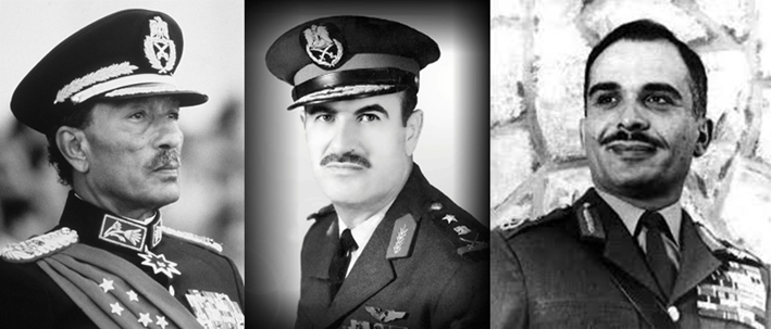 Soldan sağa; 06 Ekim 1981 günü Mısır’ın Süveyş Kanalını geçişini kutlamak için düzenlenen törende suikasta kurban giden Mısır Devlet Başkanı Anwar Sadat,  Suriye Hava Kuvvetlerinde Korgeneral rütbesiyle görülen Suriye Devlet Başkanı Hafez al-Assad (Fotoğraf: Tom Cooper) ve Ürdün Kralı Hussein.