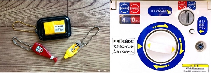 Solda Gacha makinelerinden alabileceğiniz ketchup, karashi (Japon hardalı) ve Japon omletinin minyatür örnekleri, sağda ise bir Gacha makinesi üzerindeki kolayca anlaşılabilir (!) kullanım talimatları görülmektedir. Kaynak: MATCHA