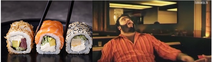 Solda bir suşi tabağı, sağda ise Recep İvedik-2 adlı filmde; ‘‘Acı macı bize işler mi bacı’’ diyerek ekmek arası Wasabi yiyen başrol oyuncusu Şahan Gökbakar’ın tepkisi. Kaynak: izlesene