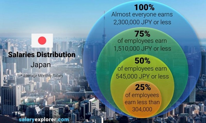 Aylık ücret medyanı 545.000 JPY’dir, bunun anlamı; nüfusun %50’sinin aylık gelirinin 545.000 JPY’den az, diğer yarısının ise bu değerden fazla olmasıdır.
