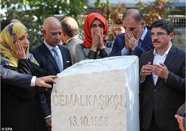 Cemal Kaşıkçı’nın nişanlısı Hatice Cengiz (ortada) ve Washington Post gazetesinin sahibi Jeff Bezos (soldan ikinci), İstanbul’da Cemal Kaşıkçı için yapılan mezar taşı önünde dua ederken görülmektedir. Fotoğraf: EPA.