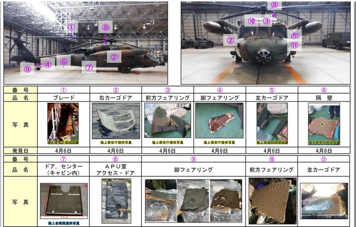 Japonya Kara Savunma Kuvvet komutanlığının 13 Nisan 2023 tarihinde paylaştığı bilgi broşüründe, 06 Nisan 2023 günü Okinawa vilayetinde bulunan Miyako Adası açıklarında suya çakılan UH-60JA Black Hawk (Kara Şahin) modeli helikoptere ait bulunan parçalar gösterilmektedir.
