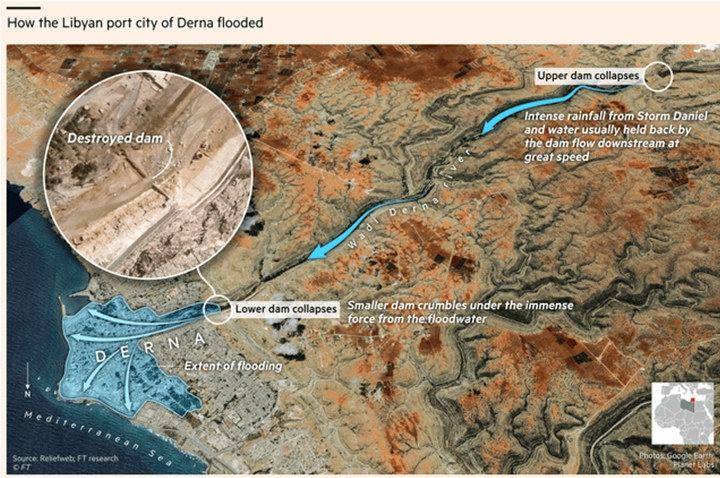 Derna kenti, 60 kilometre uzunluğunda olan ve kentin içinden geçen Derna Vadisi yamaçlarına inşa edilmiştir. İlk önce Abu Mansour, ardından da Al-Bilad barajı çökmüştür. İki barajın inşa maksadı da su toplamak değil, kenti sel felaketlerinden korumaktır.