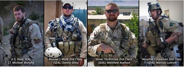 Matthew G. Axelson, Daniel R. Healy, James Suh, Marcus Luttrell, Eric S. Patton ve Michael P. Murphy, 18 Haziran 2005 tarihinde Afganistan’da kameralara poz verirken görülmektedir. 10 gün sonra Luttrell hariç tamamı, Danny Dietz ve 13 diğer Deniz Piyade komandosuyla birlikte hayatlarını kaybedecektir. Kaynak: U.S. Navy via Getty Images.