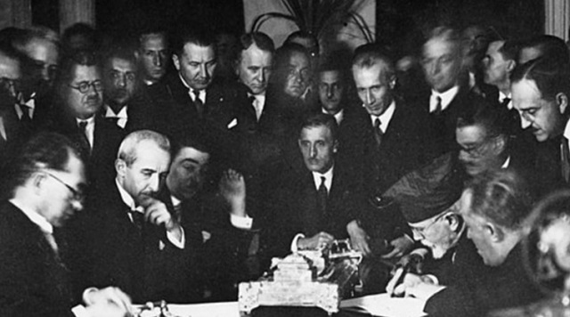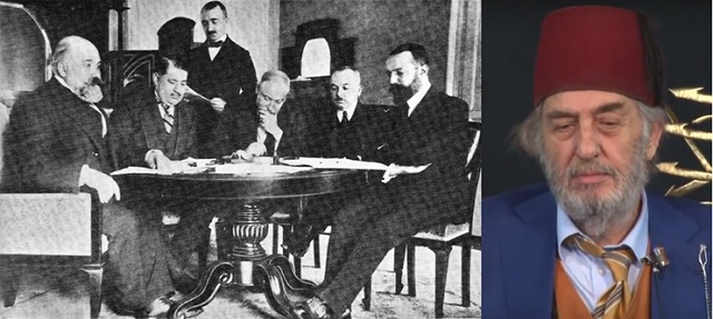 Aşağıdaki fotoğrafta gördüğünüz Osmanlı temsilcilerinden biri Rumbeyoğlu Fahreddin Bey’dir. Bu adam kim mi? Türk milleti bir milli mücadele verirken, Kuvayı Milliye’yi kurmuşken, bu adam Kuvayı Milliye’nin karşısına Damat Ferit’in kurduğu Kuvayı İnzibatiye ile çıkan adamdır ve Yunan ordusunun yanında olmuştur. Savaş kazanılınca sürgün edilenlerin arasında yer almıştır. 12 Adaları İtalya’ya bırakan heyetin içerisinde bu adam vardı.
