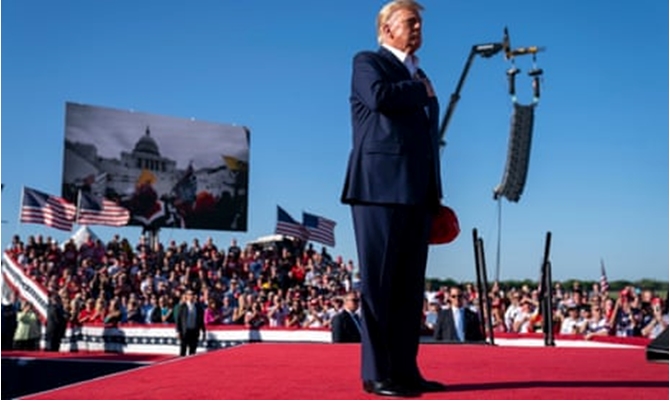 Eski ABD Başkanı Donald Trump, ‘‘2024 son savaştır’’ sloganıyla başlattığı seçim kampanyasının ilk mitinginde ‘‘Justice for All’’ şarkısını dinlerken, arkasındaki dev ekranda Kongre Binası baskınıyla ilgili görüntüler paylaşılmıştır. Kaynak: The Guardian