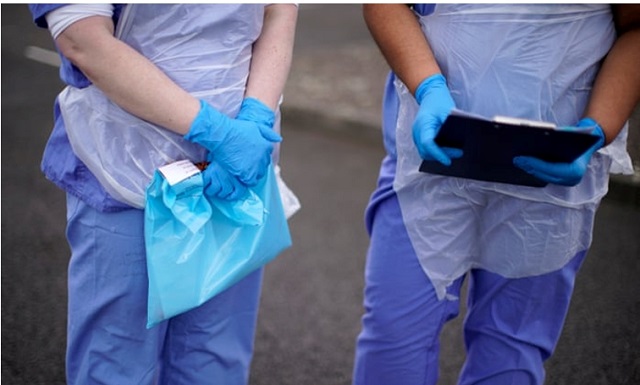 Ulusal Sağlık Servisi görevlisi bir hemşire, elinde korona virüs test kiti ile araçlarındaki insanlara test uygulanan bir araç park yerinde beklerken. 12 Mart 2020, Wolverhampton. Foto: Christopher Furlong/Getty Images