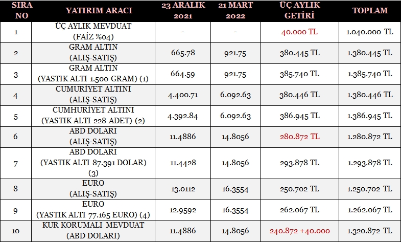 Tablo incelendiğinde; bir milyon lirasını 23 Aralık 2021 tarihinde üç ay süreli mevduat hesabına yatıranların sadece kırk bin liracık kazanç elde ettiği görülmektedir. Üç aylık sürede en fazla kazanç elde edenler ise yastık altında zaten 1.000.000 (Bir Milyon) tutarında gram altın, Cumhuriyet altını, Dolar ve Euro olanlar ve belirtilen tarih aralığında bunları yastık altında tutmaya devam edenlerdir. En yüksek kazancı sırasıyla; Cumhuriyet altını (1.386.945 TL), gram altın (1.385.740 TL), ABD doları (1.293.878 TL) ve Euro (1.262.067 TL) getirmiştir.