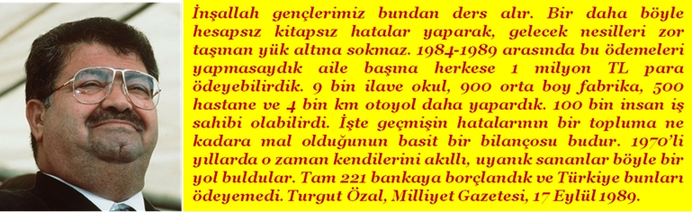 ‘‘İnşallah gençlerimiz bundan ders alır. Bir daha böyle hesapsız kitapsız hatalar yaparak, gelecek nesilleri zor taşınan yük altına sokmaz. 1984-1989 arasında bu ödemeleri yapmasaydık aile başına herkese 1 milyon TL para ödeyebilirdik. 9 bin ilave okul, 900 orta boy fabrika, 500 hastane ve 4 bin km otoyol daha yapardık. 100 bin insan iş sahibi olabilirdi. İşte geçmişin hatalarının bir topluma ne kadara mal olduğunun basit bir bilançosu budur. 1970’li yıllarda o zaman kendilerini akıllı, uyanık sananlar böyle bir yol buldular. Tam 221 bankaya borçlandık ve Türkiye bunları ödeyemedi.’’ Turgut Özal, Milliyet Gazetesi, 17 Eylül 1989.
