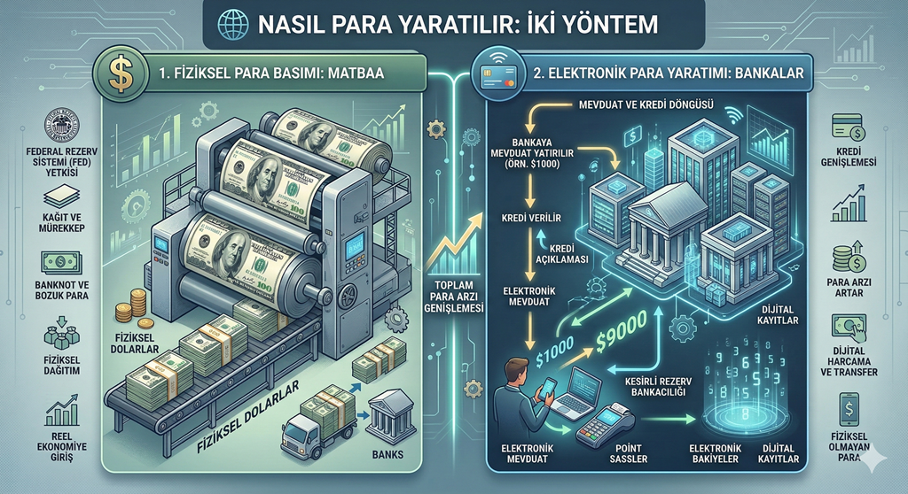 Doları sadece FED üretmez. Şöyle anlatayım. Dünyada tedavülde dolaşan kâğıt paraların miktarı toplam paranın %10’u kadardır. Geri kalan %90 banka parasıdır. Yani bankalarda elektronik olarak durur. Bu parayı bankalar kredi vererek yaratır.
