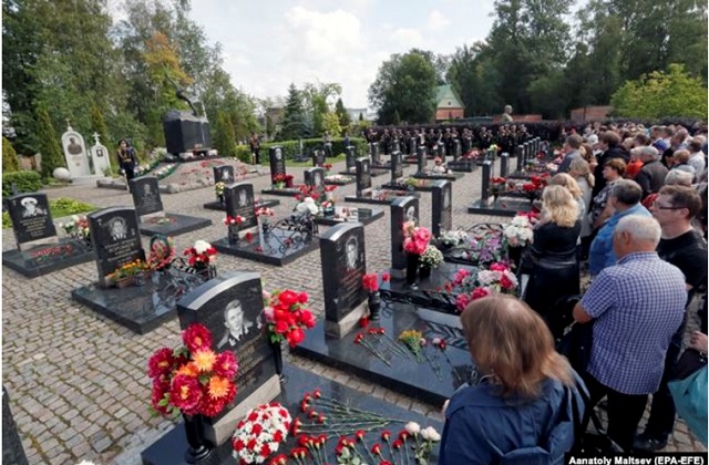 Kursk Denizaltısı faciasında yakınlarını kaybedenler, St. Petersburg kentindeki Serafimovskoye mezarlığında 12 Ağustos 2019 yılında düzenlenen anma töreni esnasında.