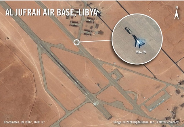 Uluslararası Af Örgütü Kriz Ekibinden (Amnesty International’s Crisis Team) silah müfettişi Brian Castner, 21 Mayıs 2020 tarihli Twitter mesajında; ülkenin orta kısımlarında yer alan Al Jufrah Hava Üssünde iki gün önce çekilen ve MiG-29 Fulcrum modeli savaş jetini üssün ana taksi yolunda bir çekici tarafından çekilirken gösteren bir uydu görüntüsünü paylaşmıştır. ‘‘The War Zone’’ adlı haber ve medya sitesinin elinde; bu savaş uçaklarının yanı sıra başka yeni hava araçlarının sayısının daha net olarak doğrulanabilmesi maksadıyla, üssün geçmişte çekilen uydu görüntüleri mevcuttur.