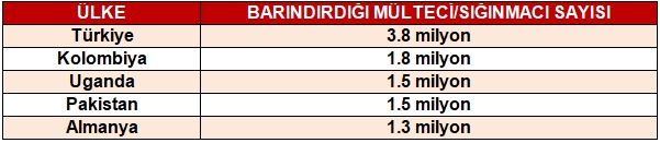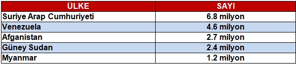 UNHCR verilerine göre mülteci/sığınmacı statüsünde en fazla vatandaşı olan ülkeler aşağıdaki tabloda görülmektedir.