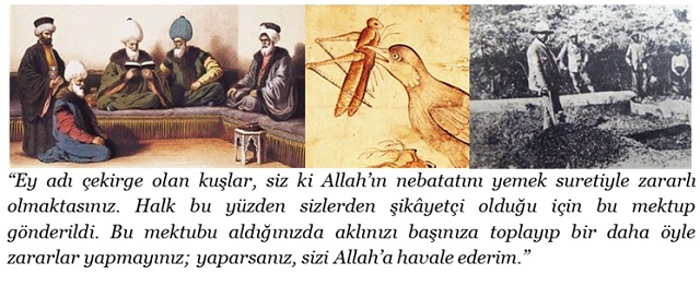“Ey adı çekirge olan kuşlar, siz ki Allah’ın nebatatını yemek suretiyle zararlı olmaktasınız. Halk bu yüzden sizlerden şikâyetçi olduğu için bu mektup gönderildi. Bu mektubu aldığınızda aklınızı başınıza toplayıp bir daha öyle zararlar yapmayınız; yaparsanız, sizi Allah’a havale ederim.”