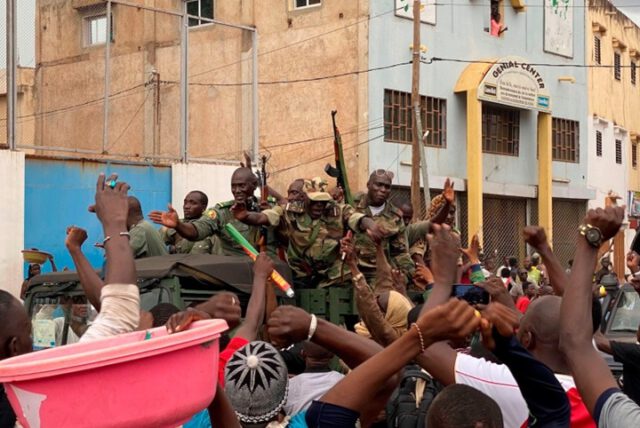 Askeri darbe sonrası halkın sevinçle selamladığı Mali askerleri. 18 Ağustos 2020. Kaynak: Malik Konate/AFP via Getty Images