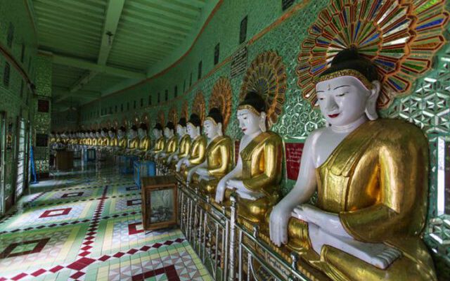 Benim Myanmar’da ziyaret ettiğim pagodalar içerisinde en çok beğendiklerimden birisi. Kolay gezilen ve renkleri ile de dikkat çekici bir görüntüsü olan bir pagoda burası. Sagaing tepesinde kayalara sırtı dayatılarak hilal şeklinde inşa edilmiş bir tapınak. Tapınağın içerisinde turkuaz renkli zemin üzerinde 45 adet, yan yana, altın yaldızlarla boyanmış ve cilalanmış gösterişli, oturur vaziyette Buda heykelleri var. Buda heykellerinin her biri, birbirinden farklı yüzlere sahip.