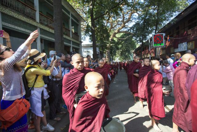 Mahagandayon manastırı, çok geniş bir alanı kapsayan ve bünyesinde binden fazla keşişi barındıran bir manastır. Bu manastır, her yaşta Myanmarlının Buda’nın öğretilerini öğrenerek keşiş olmaları için eğitim gördükleri bir öğrenim kurumu. Bu manastıra gelmemizin nedeni, keşiş adaylarının öğle yemeklerini yemeleri için girdikleri düzenli ve sessiz yemek sırasını görmek.