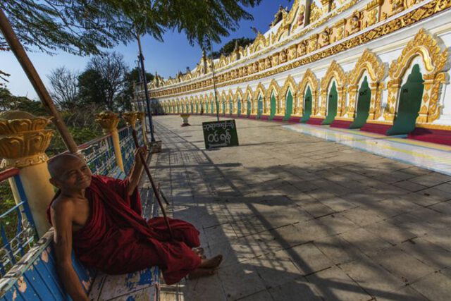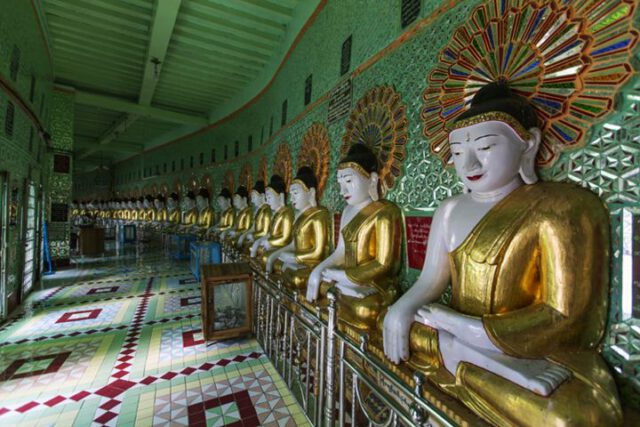 Benim Myanmar’da ziyaret ettiğim pagodalar içerisinde en çok beğendiklerimden birisi. Kolay gezilen ve renkleri ile de dikkat çekici bir görüntüsü olan bir pagoda burası. Sagaing tepesinde kayalara sırtı dayatılarak hilal şeklinde inşa edilmiş bir tapınak. Tapınağın içerisinde turkuaz renkli zemin üzerinde 45 adet, yan yana, altın yaldızlarla boyanmış ve cilalanmış gösterişli, oturur vaziyette Buda heykelleri var. Buda heykellerinin her biri, birbirinden farklı yüzlere sahip.