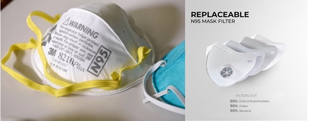 Solda N95 maskesi ve sağda düzenli aralıklarla değiştirilmesi gereken filtresi.