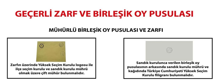 SANDIK KURULUNCA VERİLEN BİÇİM VE RENKTE OLMAYAN, TÜRKİYE CUMHURİYETİ YÜKSEK SEÇİM KURULU FİLİGRANI BULUNMAYAN KAĞITTAN İMAL EDİLMİŞ, YSK AMBLEMİ, İLÇE SEÇİM KURULU MÜHRÜ, SANDIK KURULU MÜHRÜ YER ALMAYAN, TAMAMI YIRTILMIŞ, İLÇE SEÇİM KURULU VE SANDIK KURULU MÜHRÜ DIŞINDA HERHANGİ BİR MÜHÜR, İMZA, YAZI, PARMAK İZİ VEYA HERHANGİ BİR İŞARET BULUNAN ZARFLAR GEÇERSİZ SAYILACAKTIR.
