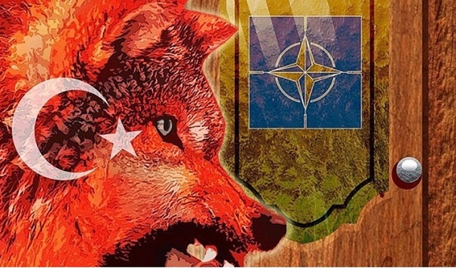 ‘‘NATO Türkiye’den Kurtarılmalıdır’’ başlıklı makaleden alıntıdır. İllüstrasyon NATO’nun üye ülke Türkiye ile olan zor durumunu yansıtmaktadır. İllüstrasyon: Greg Groesch/The Washington Times.