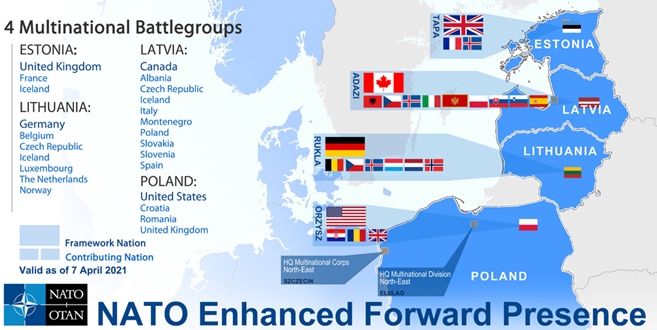 NATO Gelişmiş İleri Mevcudiyeti – Estonya, Letonya, Litvanya ve Polonya’da konuşlu çok uluslu muharebe grupları ve katkı sağlayan üye ülkeler.