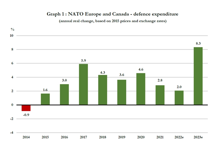 Son tahminler, Avrupalı Müttefikler ve Kanada’nın savunma harcamalarının 2023 yılında %8,3 oranında artacağını ve bu ülkelerin 2014’ten bu yana reel olarak neredeyse 450 milyar ABD doları tutarında ekstra kümülâtif yatırımla savunma harcamalarını art arda dokuzuncu kez artıracağını göstermektedir.