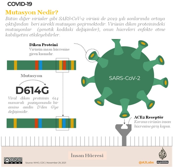 Türkiye Cumhuriyeti Sağlık Bakanlığı tarafından yayımlanana COVID-19 Sözlüğü’nde yer alan bilgilere göre mutasyon; bir organizma veya virüsün genetik materyalinde meydana gelen kalıcı değişikliktir. Yukarıdaki şekilde D aspartik asidinin, G glisin aminoasidine dönüşmesidir (D614G).
