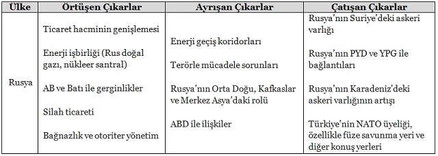 Yukarıdaki tablo Türk ve Rus çıkarlarının hangi alanlarda örtüştüğü, ayrıştığı ve çatıştığını gösteren özet bir değerlendirmedir. Ticaret ve enerji son zamanlarda asıl işbirliği sahalarından bir tanesi haline gelmiş ve beklenen TurkStream (Türk Akımı) projesi de bu trendi daha da ileriye götürecek gibi görünmektedir.