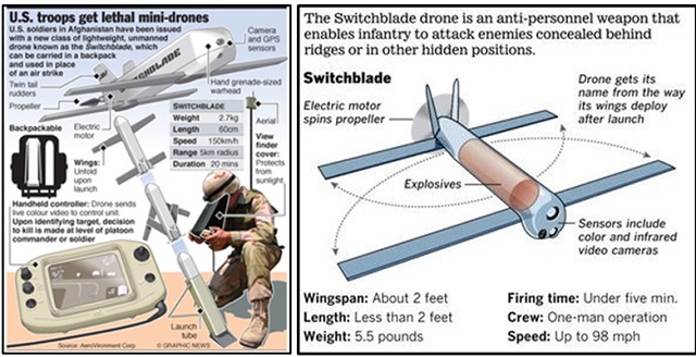 ABD Ordusu, Afganistan’da kullanmak üzere ‘‘SwitchBlade’’ isimli ölümcül mini dronları envanterine katmıştır. Sırt çantasında taşınabilecek büyüklükteki bu havada dolanan katil mühimmatlar, sırtların gerisinde veya diğer yerlerde gizlenen düşman personeline karşı geliştirilmiştir.