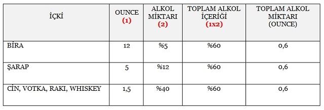 Bu hesaplamayı yapabilmek için gereken; İçki Başına Ağırlık verisi aşağıdaki tablodan bulunabilir.
