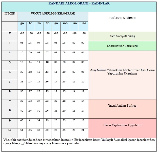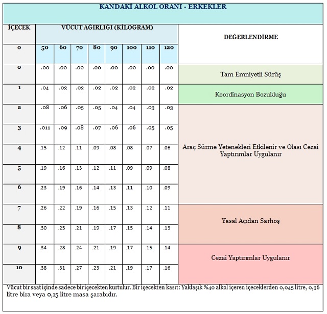 Kandaki alkol yoğunluğu ve kandaki alkol oranının sıfırlanması için gereken zaman; cinsiyet, vücut ağırlığı, ilk içkiden sonra geçen süre ve içilen içkinin cinsi ve miktarı girilerek https://www.alcohol.org/bac-calculator/ web sitesindeki uygulamadan öğrenebilir.
