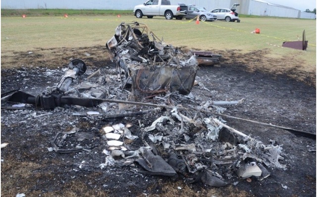 Hangi hava aracı olduğu anlaşılamayan bu tamamen yanmış enkaz, sarhoş bir pilot tarafından uçurulmaya çalışılan bir R-44 Raven II modeli helikopterdir. Kaynak: NTSB