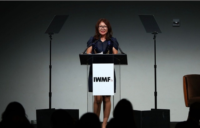 Saniya Toiken 25 Ekim 2017 tarihinde Los Angeles kentinde düzenlenen Uluslararası Kadınlar Medya Vakfı 2017 Gazetecilik Cesaret Ödülü töreninde konuşmasını yaparken. Toiken protesto gösterilerini haberleştirirken Kazakistan polisinin saldırısına uğramıştır. Kaynak: Getty Images for International Women’s Media Foundation/AFP
