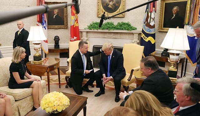 Türkiye tarafından ev hapsinde tutulurken serbest bırakılan Rahip Andrew Brunson, sadece 24 saat içinde Beyaz Ev Oval Ofis’te Birleşik Devletler Başkanı Donald Trump’a teşekkür etmiş ve onu kutsamıştır. Foto: Mark Wilson/Getty Images