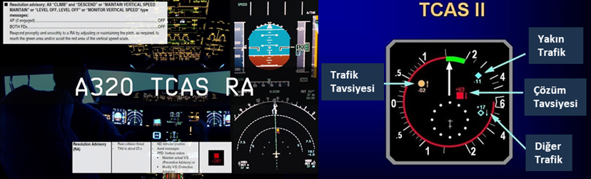 Yukarıda solda Airbus A320 uçağında bulunan Trafik İkaz ve Çarpışmadan Kaçınma Sisteminin (TCAS – Traffic Alert and Collision Avoidance System) çarpışmadan kaçınma maksadıyla pilotlara verdiği Çözüm Tavsiyesi (RA – Resolution Advisories), sağda ise TCAS II trafik ve çözüm tavsiye mesajları görülmektedir.