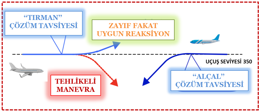 Birbirine doğru yaklaşmakta olan iki hava aracına TCAS tarafından verilen Çözüm Tavsiye mesajları; sağdaki hava aracı alçalırken, soldaki hava aracının da alçalması tehlikeli bir manevradır, aksine soldaki hava aracının tırmanışa geçmesi, zayıf da olsa uygun hareket tarzıdır.