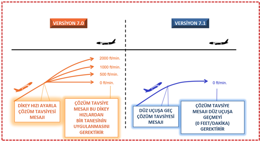 Sistemin 7.0 versiyonunda soldaki hava aracına dört adet Çözüm Tavsiye mesajından bir tanesini seçmesi mesajı verilirken, 7.1 versiyonunda derhal düz uçuşa geçmesi tavsiyesi verilmektedir.