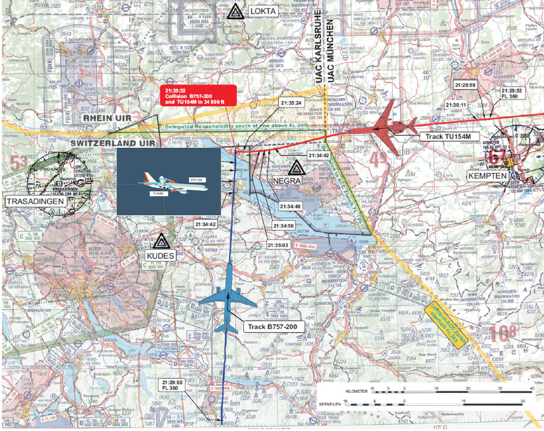 Hava Trafik Kontrol ünitesinde Kısa Vade Çarpışa İkaz (STCA – Short Term Conflict Alert) sistemi mevcuttur ve çarpışmanın olduğu bölge de sistemin kapsama alanındadır. Ancak bakım nedeniyle radar tam kapasiteyle çalışmadığında STCA fonksiyonu devre dışıdır. Hava trafik operatörü Nielsen nedense bu durumu unutmuştur. STCA fonksiyonunun devrede olması durumunda, görsel ikaz çarpışmadan 2,5 dakika önce devreye girerek Nielsen’i uyaracaktır. Oysa işitsel ikaz çarpışmadan sadece 32 saniye önce devreye girmiş ve sadece 4 saniye sonra da 7 deniz mili ayırım ihlal edildiğinden her iki hava aracının TCAS’ları devreye girerek çözüm tavsiye komutlarını vermiştir.