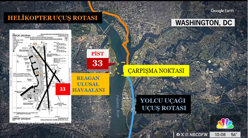 Çarpışma esnasında görüş açıktır ve Bombardier CRJ700 33 Pistine doğru son yaklaşma bacağındadır. UH-60 modeli helikopter ise ordu yetkililerine göre bir eğitim uçuşu icra etmektedir.