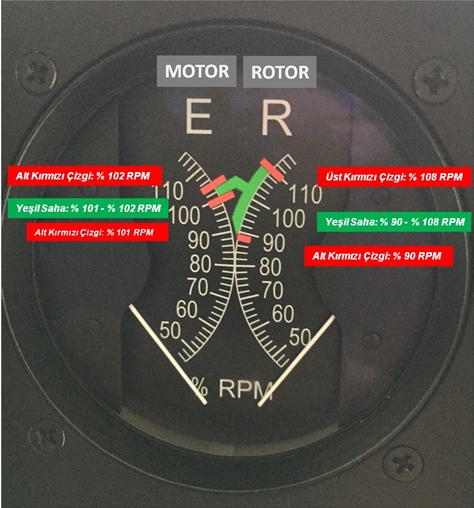 Hız aşımı, RPM (Revolution Per Minute – Dakikada Devir Adedi) takometresinde; motor RPM’i veya rotor RPM’i veya her ikisinin birden normal çalışma limitlerini (üst kırmızı çizgileri) aştığında meydana gelmektedir.