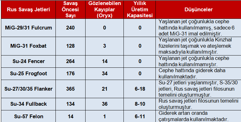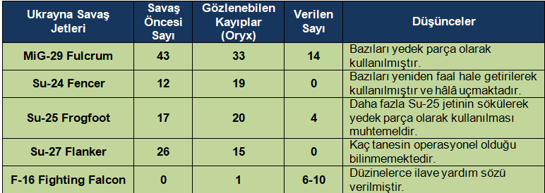 Ukrayna hava kuvvetlerinin kayıplarına bakıldığında ise bozguna uğradığı ve yerle bir edildiği sonucuna varılabilir. FlightGlobal’e göre Ukrayna’nın savaş öncesi sahip olduğu kullanılabilir savaş jeti sayısı sadece 98’dir. Açık istihbarat kaynaklarından elde edilen ve doğrulanan kayıp miktarına bakıldığında; Ukrayna’nın da yaklaşık 100 kadar sabit kanatlı hava aracı kaybettiği, bu rakamın 89’nun savaş jeti olduğu görülmektedir.