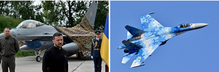 Solda F-16 savaş uçağı önünde kameralara gururla poz veren Ukrayna Devlet Başkanı Volodymyr Zelenskyy, sağda ise Ukrayna hava kuvvetleri envanterinde bulunan Su-27 Flanker savaş uçağı.